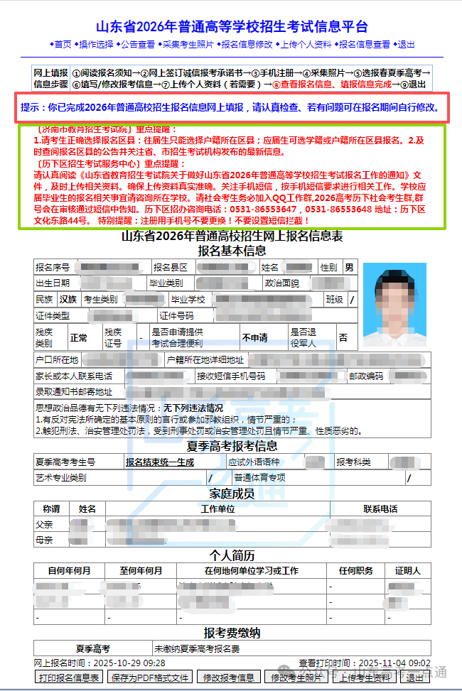考生在普高信息平台填报完成个人信息后,系统会提示:你已完成2026年普通高校招生报名信息网上填报,请认真检查、若有问题可在报名期间自行修改(下图中红色框选部分)。