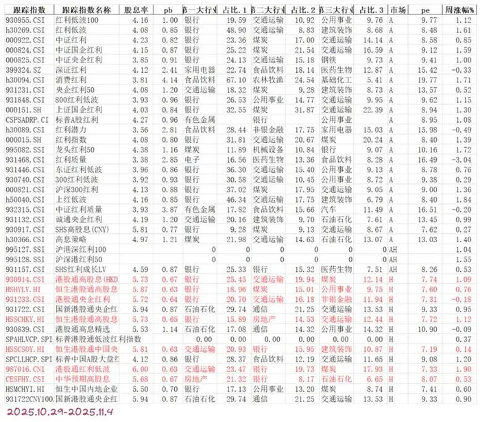 上周银行、煤炭表现较好,A股与港股的红利高股息指数表现相当,大部分实现正收益。下表中标红的指数为:股息率6%左右,而PB估值低于0.7倍。