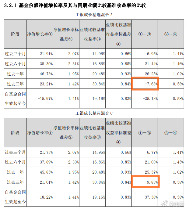 基金三季报数据显示,赵蓓管理的工银成长精选混合C近三年净值增长率仅21.01%,跑输业绩比较基准(30.84%)9.83个百分点,距离“10%”的降薪红线只差0.17个百分点;