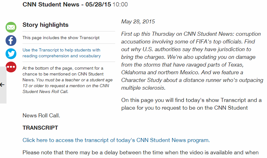 它是面向美国中学生的一档新闻节目,从时事政治到生活琐事,包罗万象,语速、词汇量适中,非常适合中级学习者进行提高。CNN官网上每个工作日都会更新一期节目,而且每期节目都带有完整的听力文本(这个很重要),往期的节目资源在网上也非常容易找到。比如这是之前的一期节目: