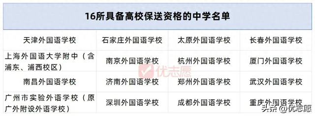 全国共16所外国语中学拥有保送资格,这些学校推荐的学生,经外语能力测试等考核环节合格后,可获得高校保送资格。