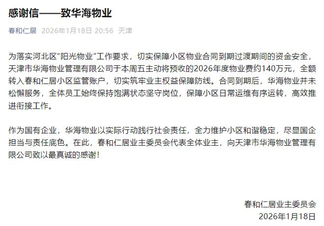 ▲ 2025年11月22日,春和仁居小区整体提升改造项目,南门至居委会路段完工1月18日,春和仁居小区发布致物业的感谢信,信中提到,天津市华海物业管理有限公司于本周五主动将预收的2026年度物业费约140万元,全额转入春和仁居小区监管账户。