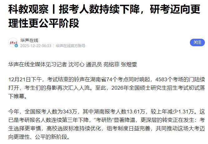 这篇文章评论分析考研热真的退了,但这条路更清楚了,考研报名人数连续下降,成了一个明确信号,以往那种千军万马争过独木桥的景象,确实在变化,图书馆里备考座位不再需要凌晨抢夺,校园中关于考研的讨论也减弱了许多,这未必是坏事,更像是一种集体选择的理性回归,一种社会心态趋于冷静的体现。