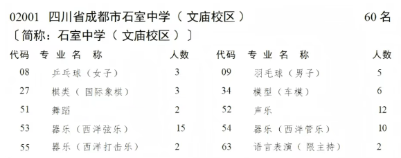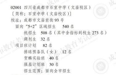 石室文庙2025年面向“5+2”学区招收学生540名,其中统招生508名(含指标到校生273名),调剂生32名;项目班招生82名,其中贺麟实验班40名,强基计划班30名,排球预备队(女)12名;另招收艺体生60人。