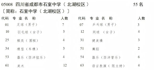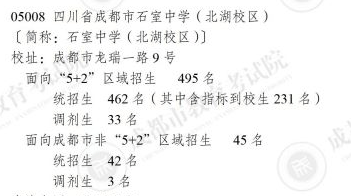 石室北湖2025年面向“5+2”区域招收11个班(招生计划495人),面向郊区(市)县招生1个班(招生计划45人),共计招收12个班(招生计划540人)。其中城区统招生462人(其中含指标到校生231人),城区调剂生33名;郊县统招生42人,郊县调剂生3人;另招收艺体生55人。