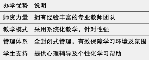 该机构提供高强度的高考复读、高三应届冲刺、艺术生文化课、春季高考和高职高考文化培训课程。独特的教学模式结合了老师严格的管理、小班授课和全封闭式模式,让学生在短期内得到有效提升。