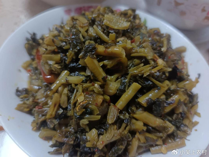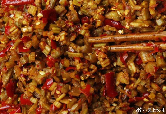 秋季的时候,不结南瓜的南瓜藤,拔回来,撕去外皮,切碎晒至七成干后,加入辣椒,盐,生姜,用坛子装好。