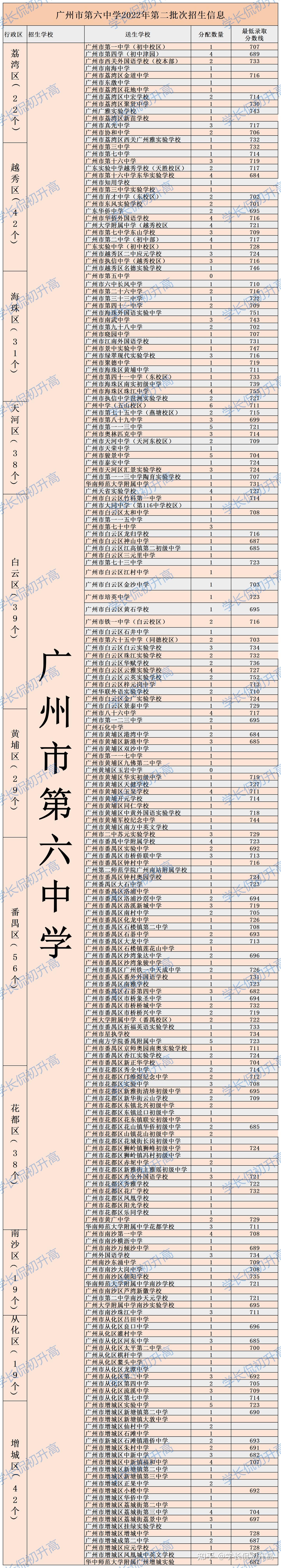 花都区:38个名额,拥有第六中学名额分配的学校有23所,4所送生学校的分数低于710分,11所学校流标;