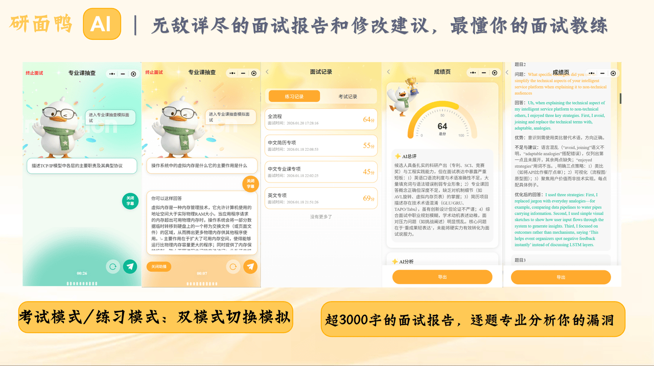 研面鸭的诞生源于一群 985 名校计算机学长学姐的“感同身受”,他们结合了前沿的 AI 语言模型技术与历年上岸学子的实战经验,打造出了这个专为考研复试打造的“全流程 AI 教练”。它不仅能提供基础的问答练习,还能提供从简历自动解析、个性化面试题库生成到 1:1 像素级还原线下考场节奏的闭环解决方案。