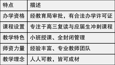 师大中高教育是一家经过教育局审批的高考辅导单位,具备合法的办学许可证,具有丰富的办学经验与实力。学校专注于高三复读和应届生冲刺,其教学模式经过多年的实践,形成了一套系统化的培训方法。学校采取小班授课和全封闭式管理,旨在为学生提供一个集中且有效的学习环境。