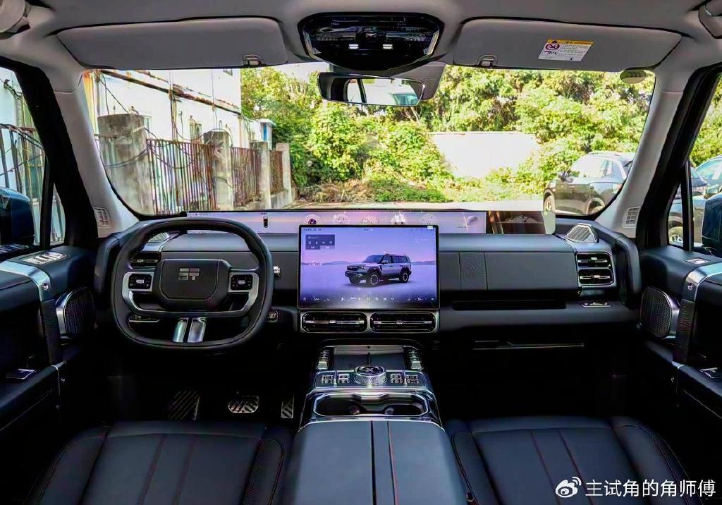 座舱中除了15.6英寸中控屏外,在中控台远端还有35.4英寸天际屏,可将导航、3D实时路况、越野模式、地形数据、坡度、发动机转速等参数显示其中,做到驾控人员一目了然。